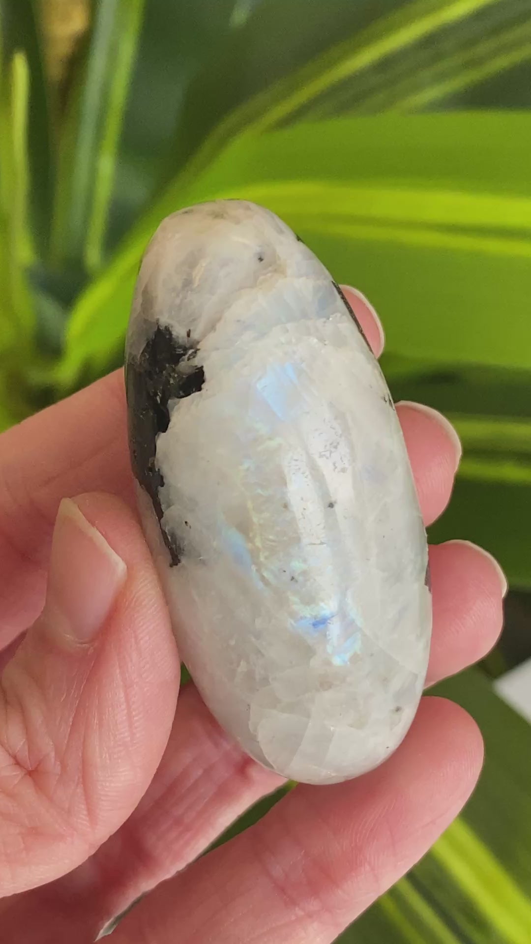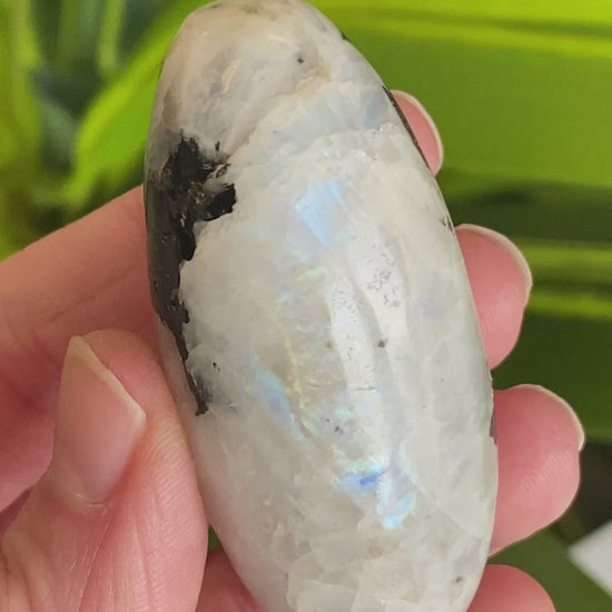 A lovely Rainbow Moonstone Palestine - a shiva shape. Nice flash. You will receive the exact moonstone shown. Where the Moon acts as a mirror, reflecting the sun’s light, Moonstone reflects our own light within. It deepens our understanding of ourselves and our motivations. Moonstone is considered ideal for new beginnings because it both guides us towards our best path and helps inspire us to make our first move with confidence. Rainbow Moonstone acts as a prism, diffusing energy throughout the aura and stimulating all Chakras. It is thought to provide psychic protection. Rainbow Moonstone is especially useful for clearing the mind and senses. Also used for lucid dreaming and deeper sleep. Its light deflects negativity, eases painful memories or trauma, and brings a sense of well-being. Considered a calming stone.