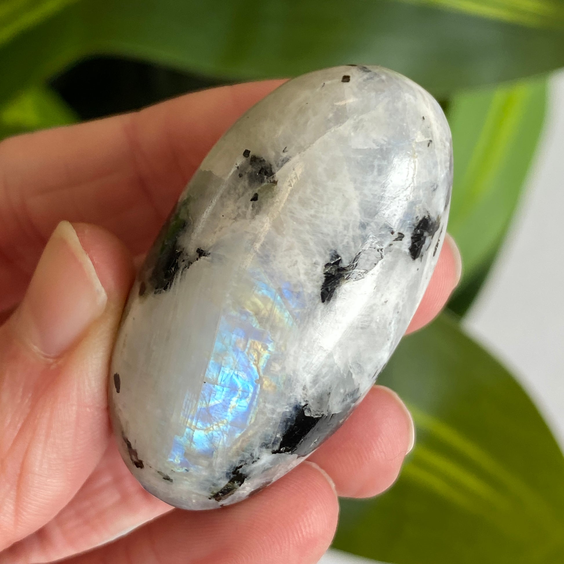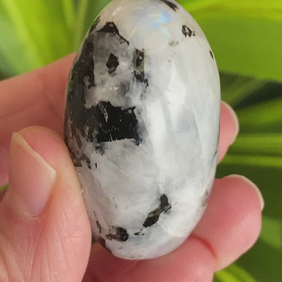 A lovely Rainbow Moonstone Palestine - a shiva shape. Nice flash. You will receive the exact moonstone shown. Where the Moon acts as a mirror, reflecting the sun’s light, Moonstone reflects our own light within. It deepens our understanding of ourselves and our motivations. Moonstone is considered ideal for new beginnings because it both guides us towards our best path and helps inspire us to make our first move with confidence. Rainbow Moonstone acts as a prism, diffusing energy throughout the aura and stimulating all Chakras. It is thought to provide psychic protection. Rainbow Moonstone is especially useful for clearing the mind and senses. Also used for lucid dreaming and deeper sleep. Its light deflects negativity, eases painful memories or trauma, and brings a sense of well-being. Considered a calming stone.