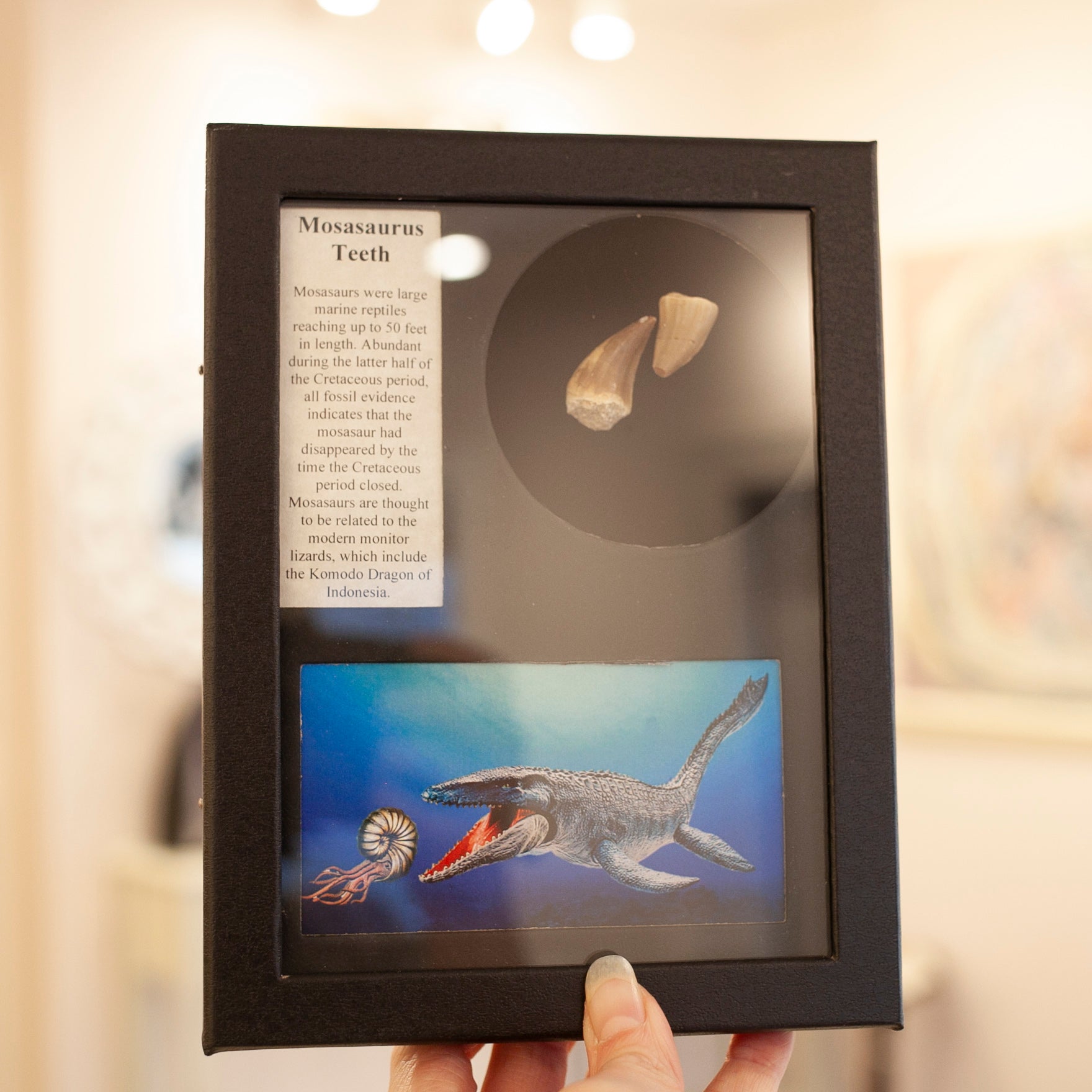 This is an authentic Mosasaurus Tooth specimen in a handmade collector case with a description card. These make great gifts and there are lots of types to choose from so you can start or add to your collection. Cases are handmade in Tuscon Arizona.