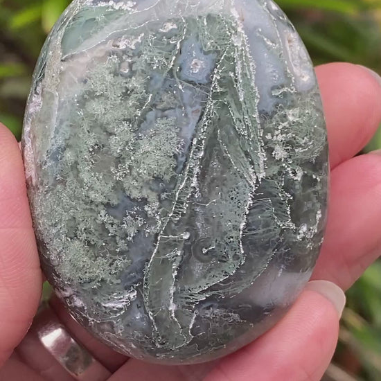 Beautiful, natural moss agate palm stone with defined inclusions of chlorite. Lots to explore. You will receive the exact Moss Agate stone shown. Moss Agate is a stone of abundance, prosperity, and growth. It attracts wealth and success while fostering emotional balance, optimism, and harmony with nature.