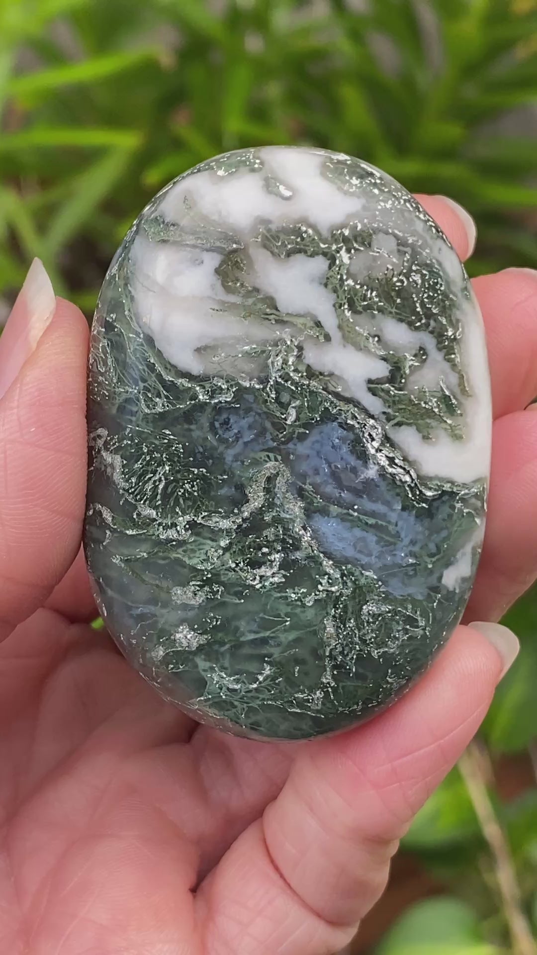 Beautiful, natural moss agate palm stone with defined inclusions of chlorite. Lots to explore. You will receive the exact Moss Agate stone shown. Moss Agate is a stone of abundance, prosperity, and growth. It attracts wealth and success while fostering emotional balance, optimism, and harmony with nature.