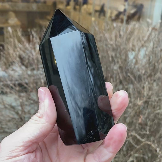 This is a large, natural Black Obsidian tower carved from genuine volcanic Obsidian. Very nice smooth finish for a natural obsidian. You will receive the exact Obsidian tower shown. Very slight sheen where the air bubbles lingered under the surface. Obsidian is a type of volcanic glass that forms when Magma rapidly cools. Associated with powerful water energy and cleansing. Black Obsidian is a stone of intuition, foresight, protection and recovery. A powerful tool for emotional and spiritual renewal and detoxification. Supports all charkas.