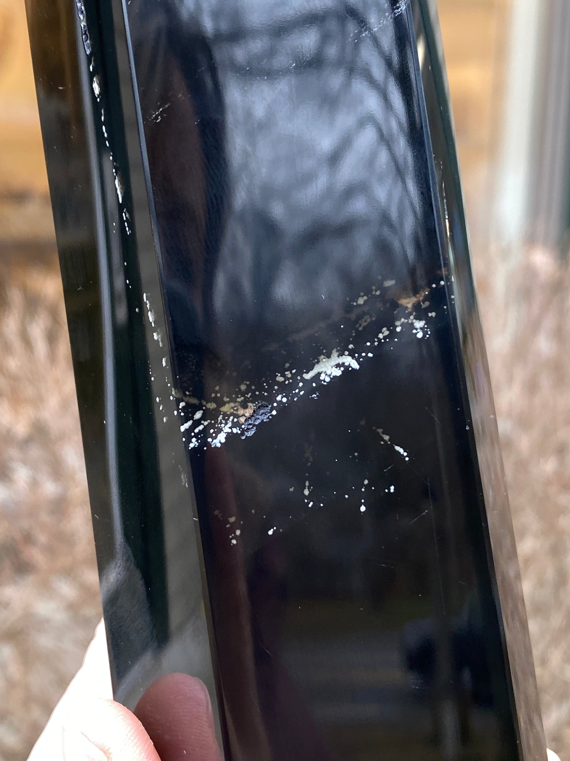 This is a large, natural Black Obsidian tower carved from genuine volcanic Obsidian. Very nice smooth finish for a natural obsidian. You will receive the exact Obsidian tower shown. A streak of air bubbles wraps around the tower. Obsidian is a type of volcanic glass that forms when Magma rapidly cools. Associated with powerful water energy and cleansing. Black Obsidian is a stone of intuition, foresight, protection and recovery. A powerful tool for emotional and spiritual renewal and detoxification. Supports all charkas.