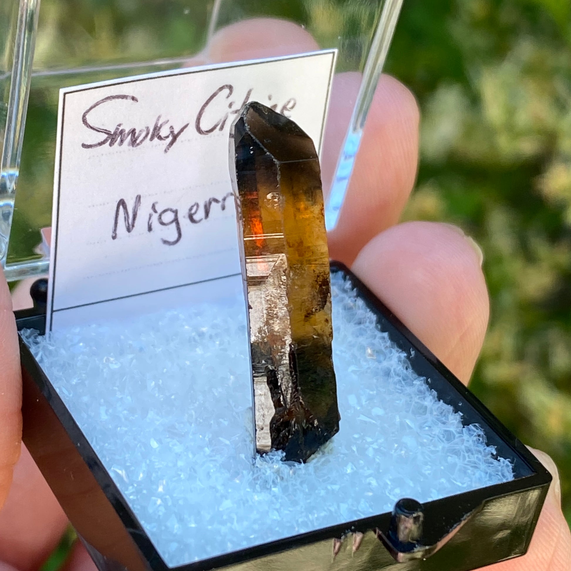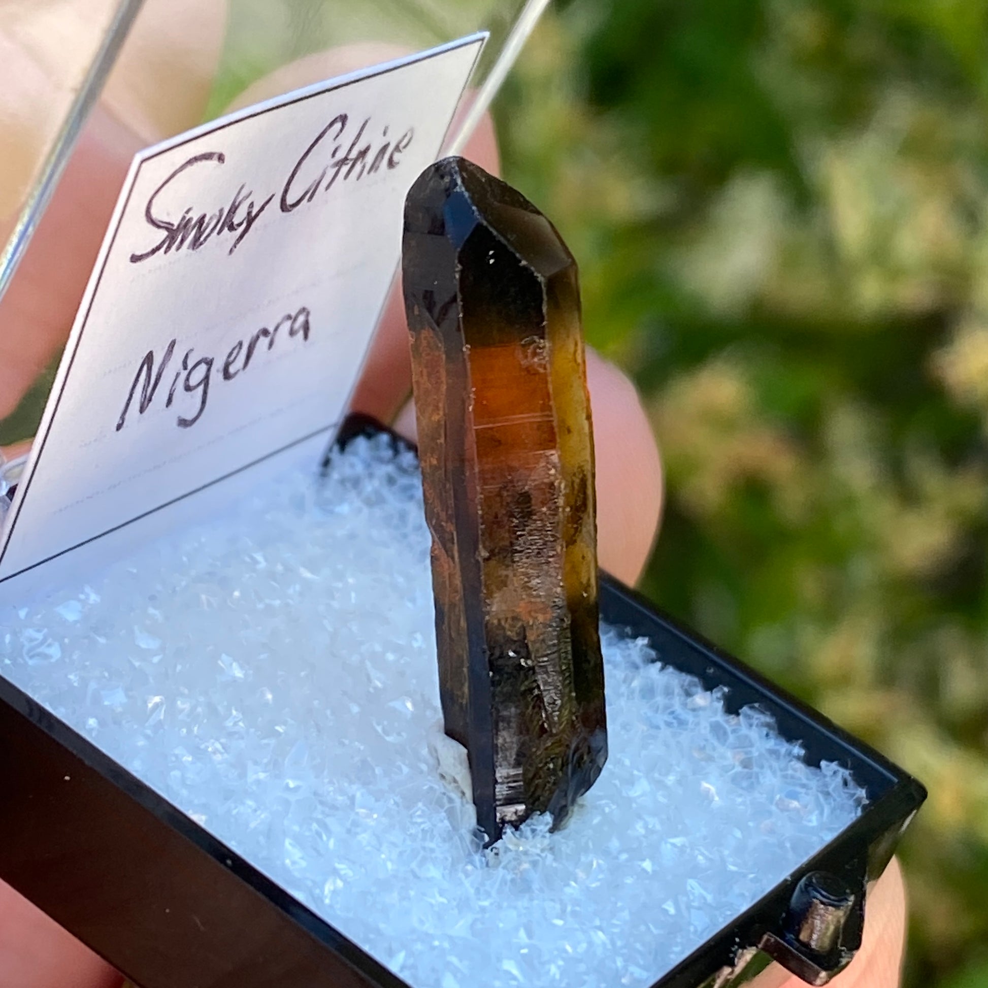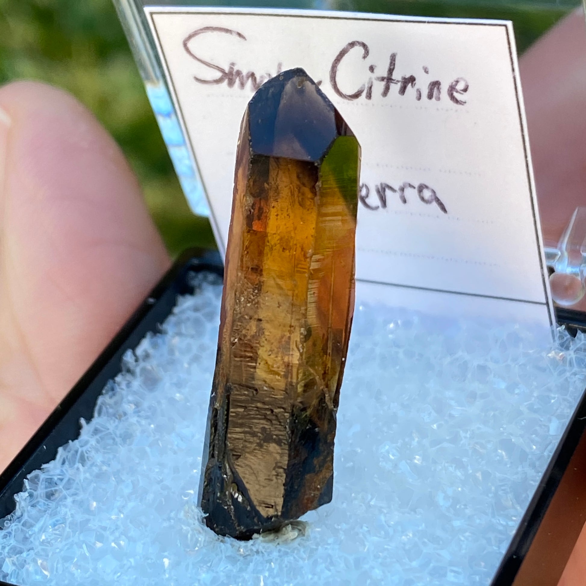 This is unpolished, unheated Citrine. Comes in the display box shown. Purchased from local collector in Rhode Island, May 2024.