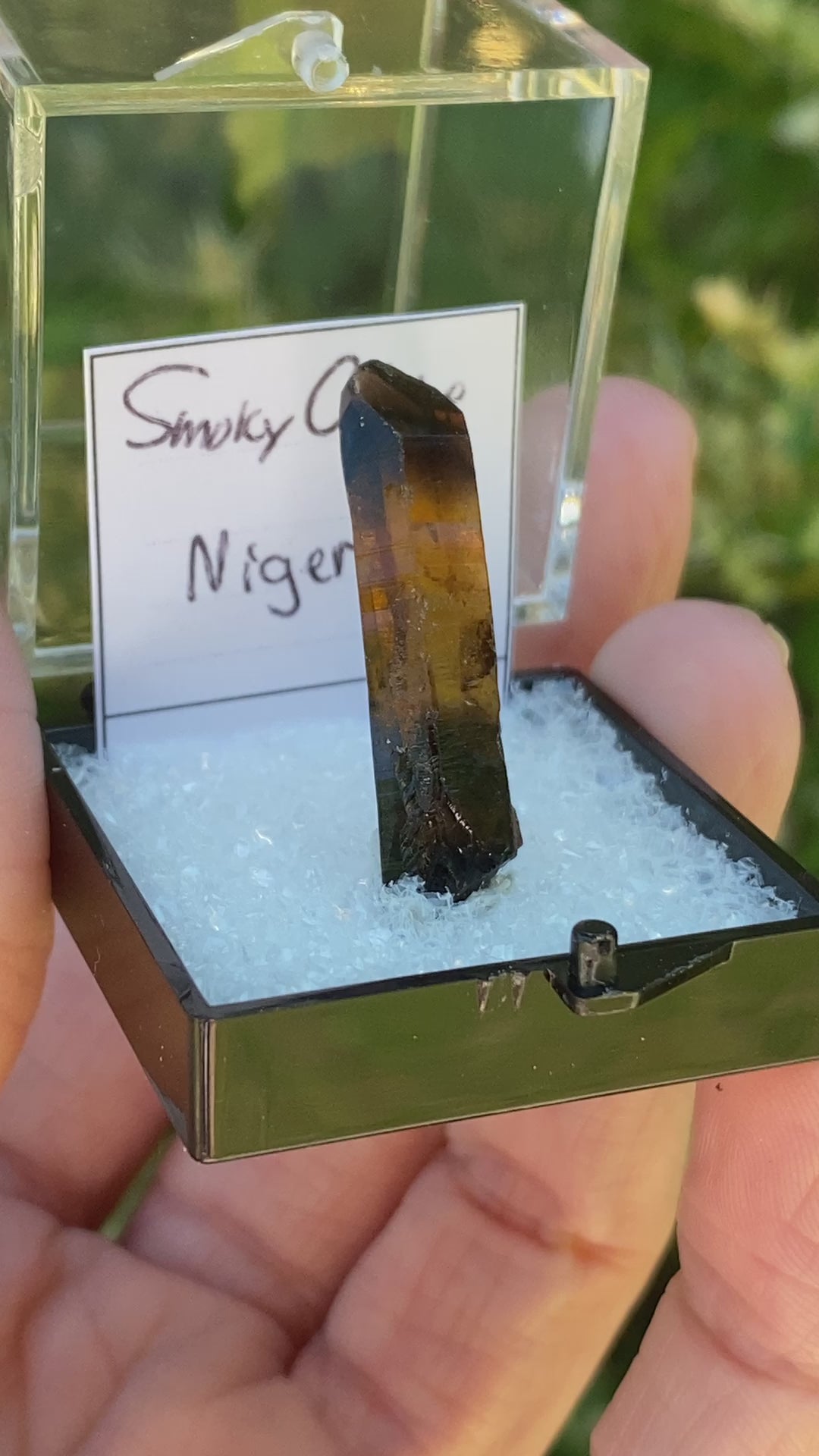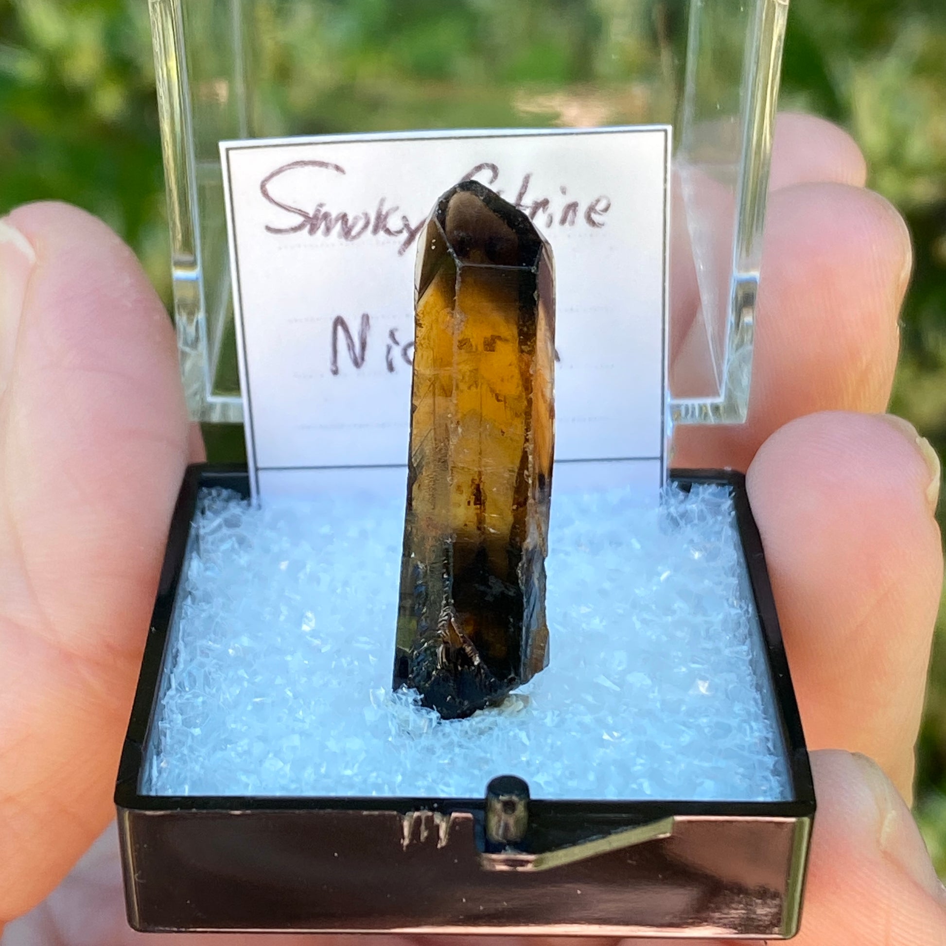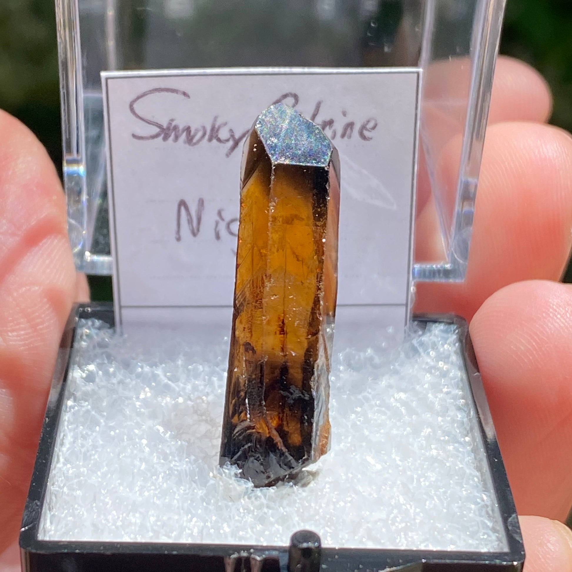 This is unpolished, unheated Citrine. Comes in the display box shown. Purchased from local collector in Rhode Island, May 2024.