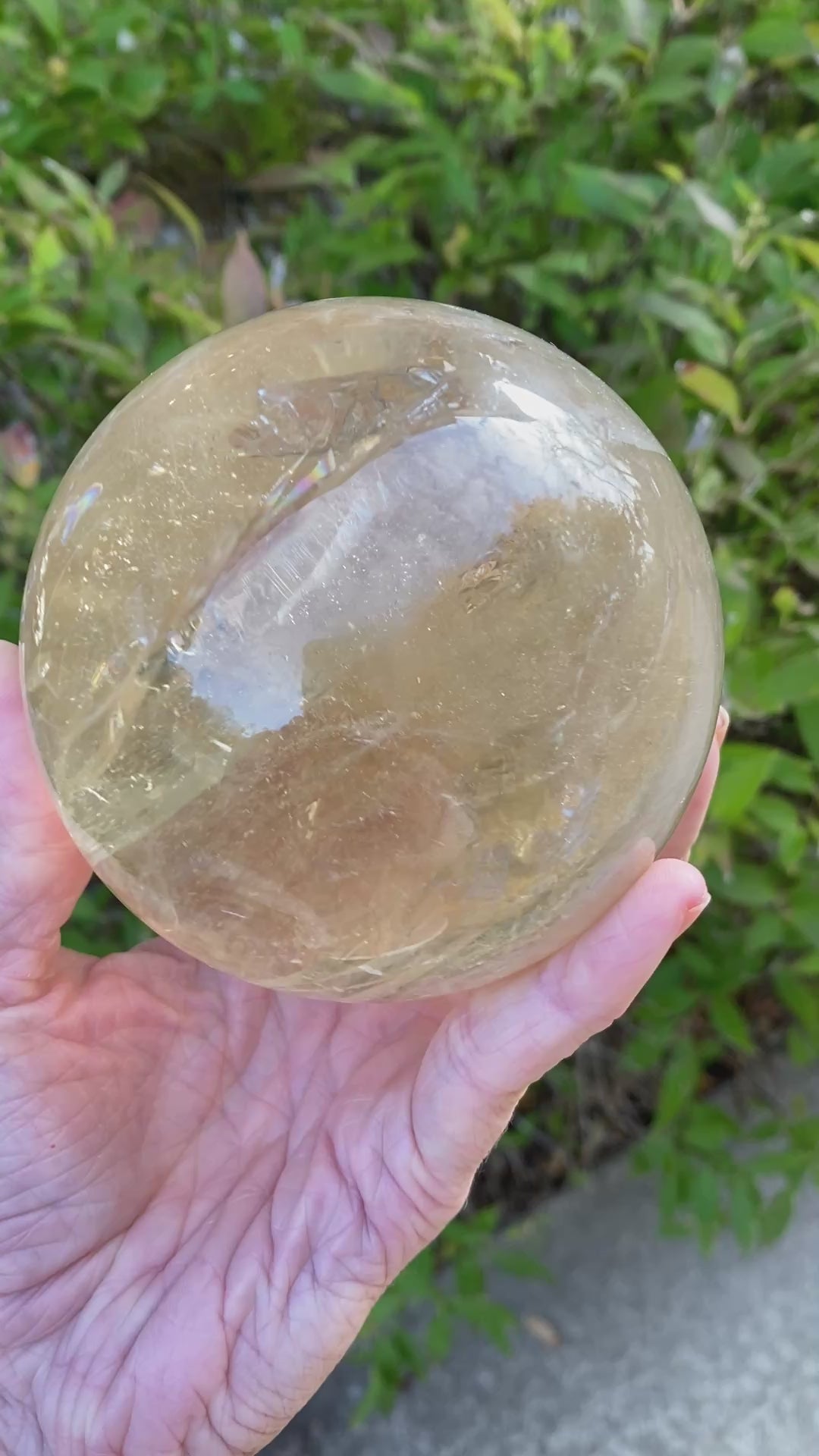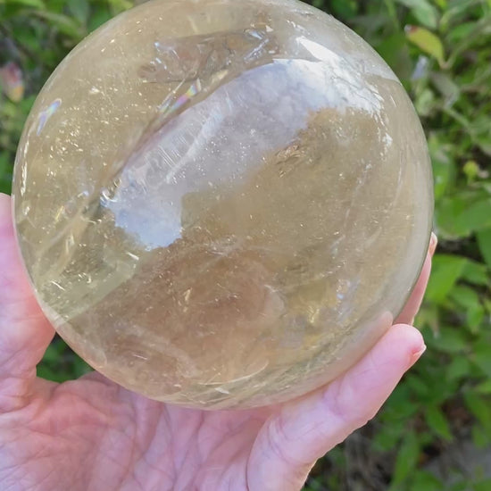 Stunning, extra-large, natural Citrine sphere. A very rare find at this price point. This sphere is from a 90's Brazilian lot of material. Totally natural color and measuring nearly 4in in diameter. Color is also excellent for the size. Much less smoky than other Natural Citrines. Natural citrine has more texture in sphere form than other materials, but still very smooth. You will receive the exact Citrine sphere shown.