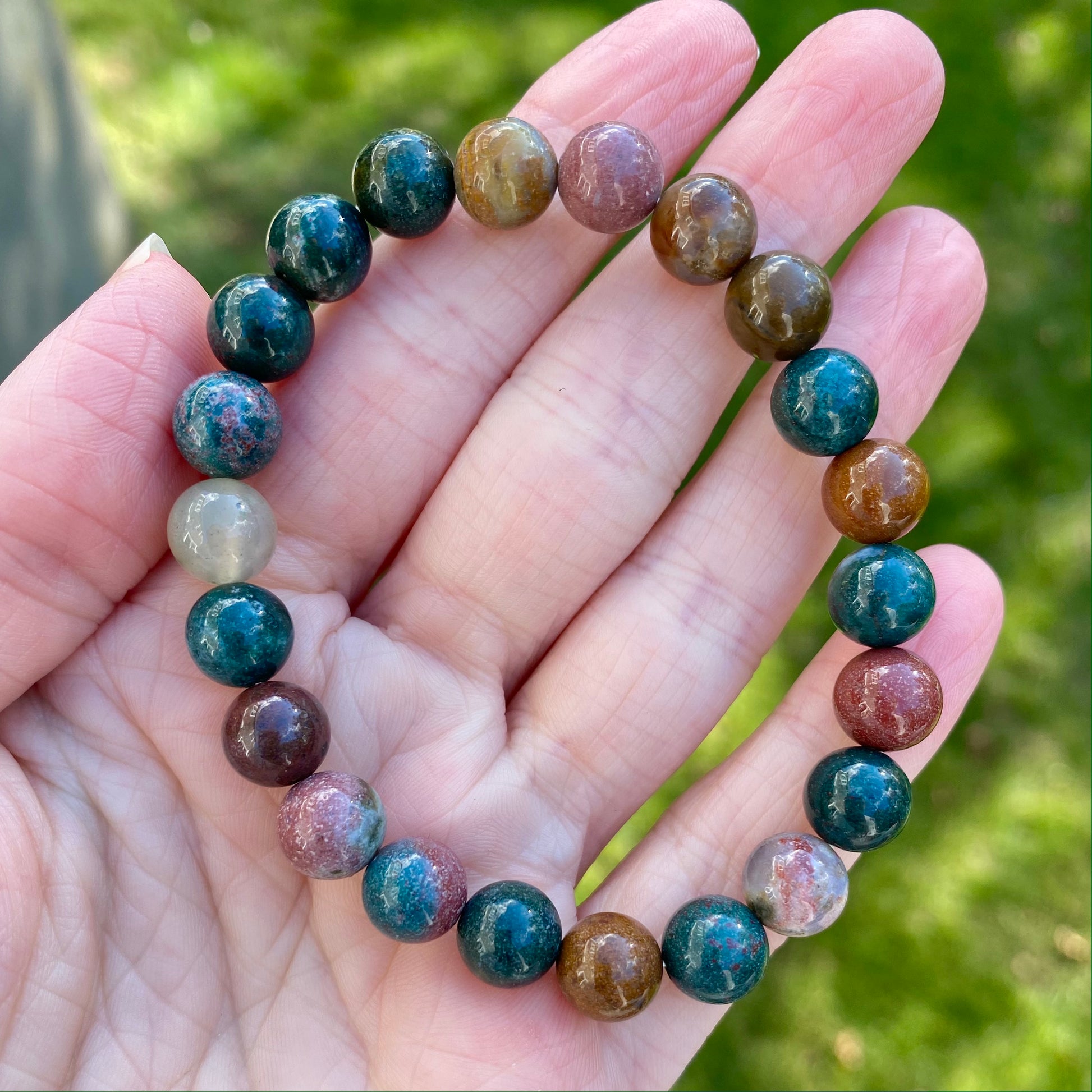 This listing is for one lovely Ocean Jasper bracelet made with natural Ocean JAsper beads in colors that range from forest green to soft mauve. Ocean Jasper calls us to Nature. It is here we can sense our interconnectedness to the Earth and all her lifeforms. The combination of nature and Ocean Jasper is a potent mix for cleansing and renewing the spirit, as well as letting go of stress and intrusive thoughts that cloud our spirit. Ocean Jasper is also a stone of restructuring - this can mean change, but more so growth and a refreshed perspective. It can reawaken forgotten passions and give new life to old ideas. In a sense, it clears the debris from our path, so we can see the bigger picture. Ocean Jasper comes from Madagascar and is formed from a powerful mix of minerals brought together during ancient lava flows.