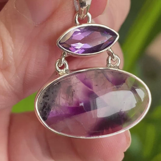 You will receive the exact pendant shown. A unique phantom amethyst and faceted amethyst combination set in .925 sterling silver. From the Tucson Gem Show 2026. Amethyst is the purple variety of Quartz.One of the most popular healing stones, Amethyst has a long history of being a collectible gem and sought for metaphysical purposes. Amethyst holds a prominent place in mythology and folklore. Its name comes from the Greek word "amethystos," meaning "not intoxicated," as ancient Greeks believed that wearing or drinking from vessels made of amethyst could prevent drunkenness. It was also thought to have protective properties against various ailments and was often used in jewelry worn by royalty and clergy throughout history. Today, Amethyst is best known for it’s powerful resonance with the third-eye and subconscious. It wards off anxiety, nightmares and helps prepare the mind for sleep, meditation or receiving information. The February birthstone.
