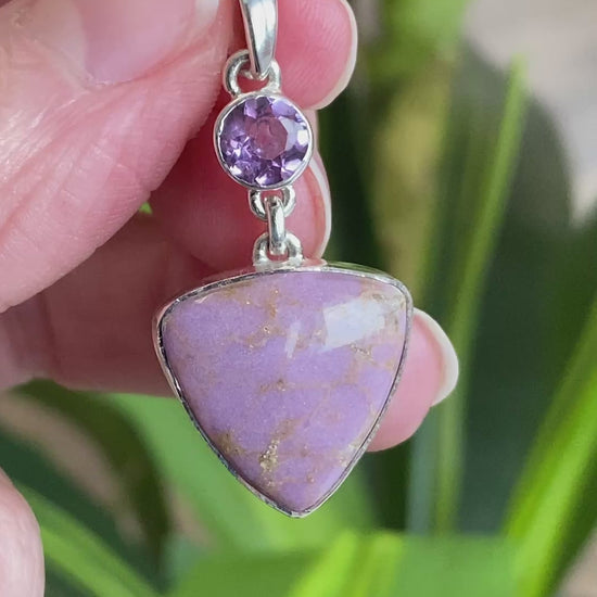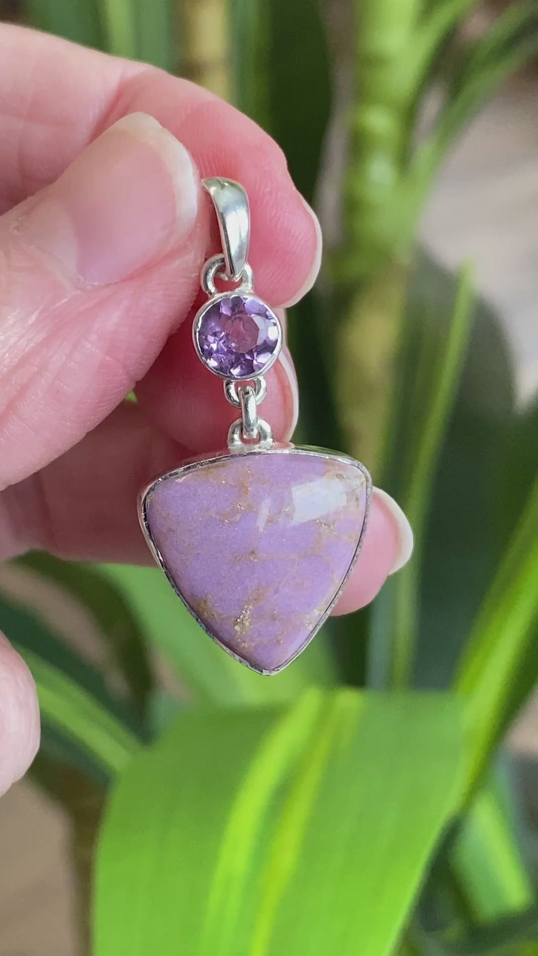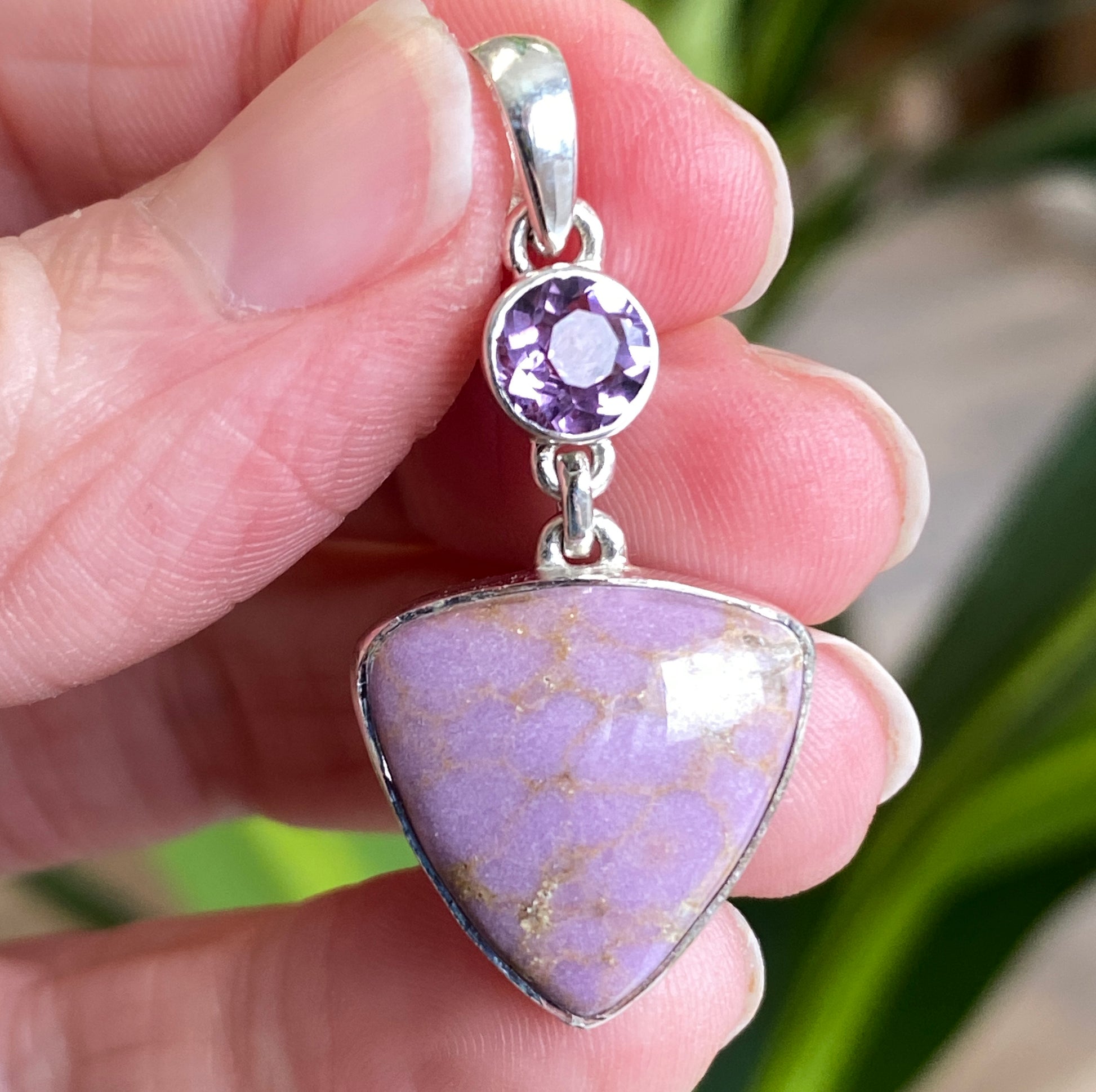 You will receive the exact pendant shown. A beautiful combination of Phosphosiderite and Amethyst set 925 sterling silver. From the Tucson Gem Show 2026. Phosphosiderite is a rare mineral with a distinctive purple color. A beautiful stone with an enchanting energy, Phosphosiderite resonates with the heart chakra and third eye, giving us insight into our true desires and helping us achieve our goals. A warm and gentle stone, Phosphosiderite alleviates worries and stress. It clears the mind and helps us find wonder in the world. A stone of inner peace, achievement and comfort.