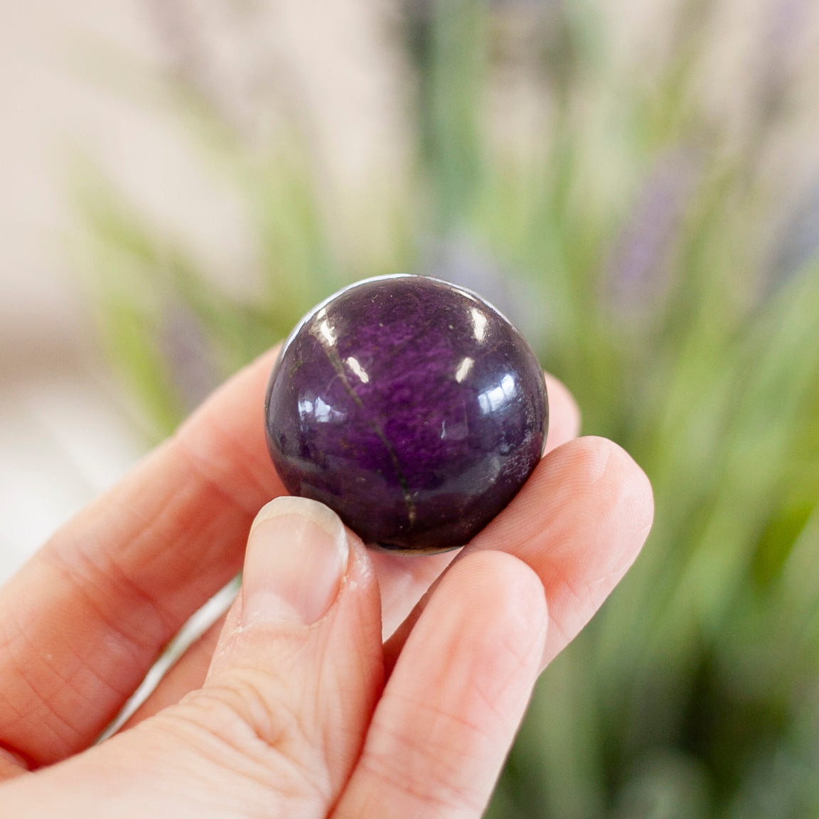 This listing is for one gorgeous, dark purple Purpurite sphere. These are high-quality Purpurite stones with deep, velvety purple color. A rare treat! An uncommon stone, Purpurite hails from Nambia. One of the purest stones of the Violet Ray, Purpurite offers purification of energy fields and opens the crown chakra. Purpurite is a Manganese Iron Phosphate that occurs with Triphylite. Iron is a powerful grounding stone of earth energy and phosphate is a stone of light and air. Purpurite is one of the rare combination stones that builds a bridge between earth and wind elements, allowing for a harmony of the spirit and emotional balance. It also offers a bridge to the divine realm, freeing us of the ego and that which keeps us bogged down in the physical realm. Purpurite is thought to stimulate experiences of ‘rapture or openness with creation. A master stone of spiritual embodiment, Purpurite helps us align our mind with the universal and eternal. Purpurite is excellent for contacting one's spirit guides through meditation or dreamwork.