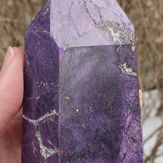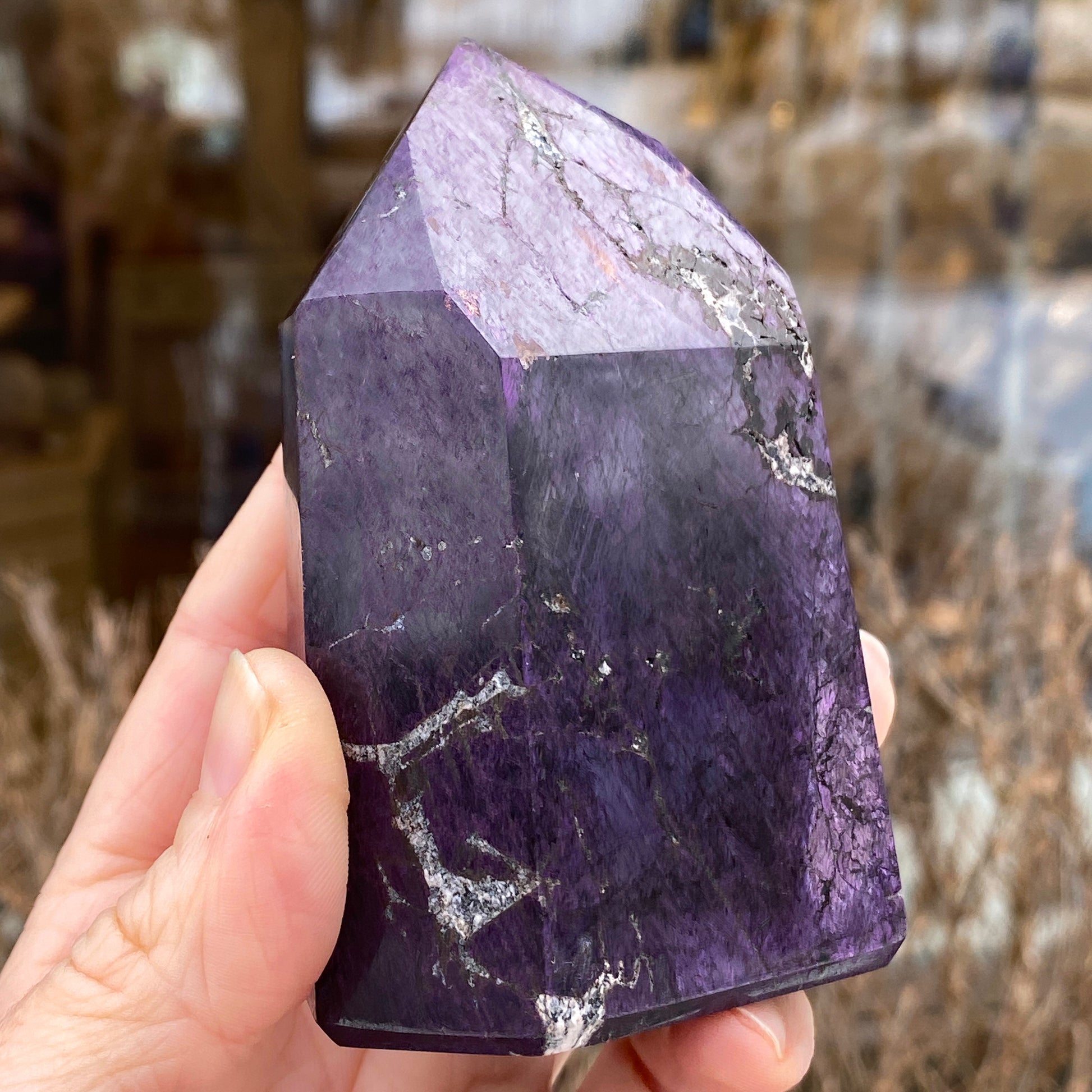 This is a large, Purpurite tower. So difficult to find nicely polished Purpurite that retains its color and flash. This piece has great color and is even more brilliant in the sun. From the Tucson Gem Show 2026. You will receive the exact Purpurite generator tower shown. Purpurite is a rare manganese iron phosphate mineral.