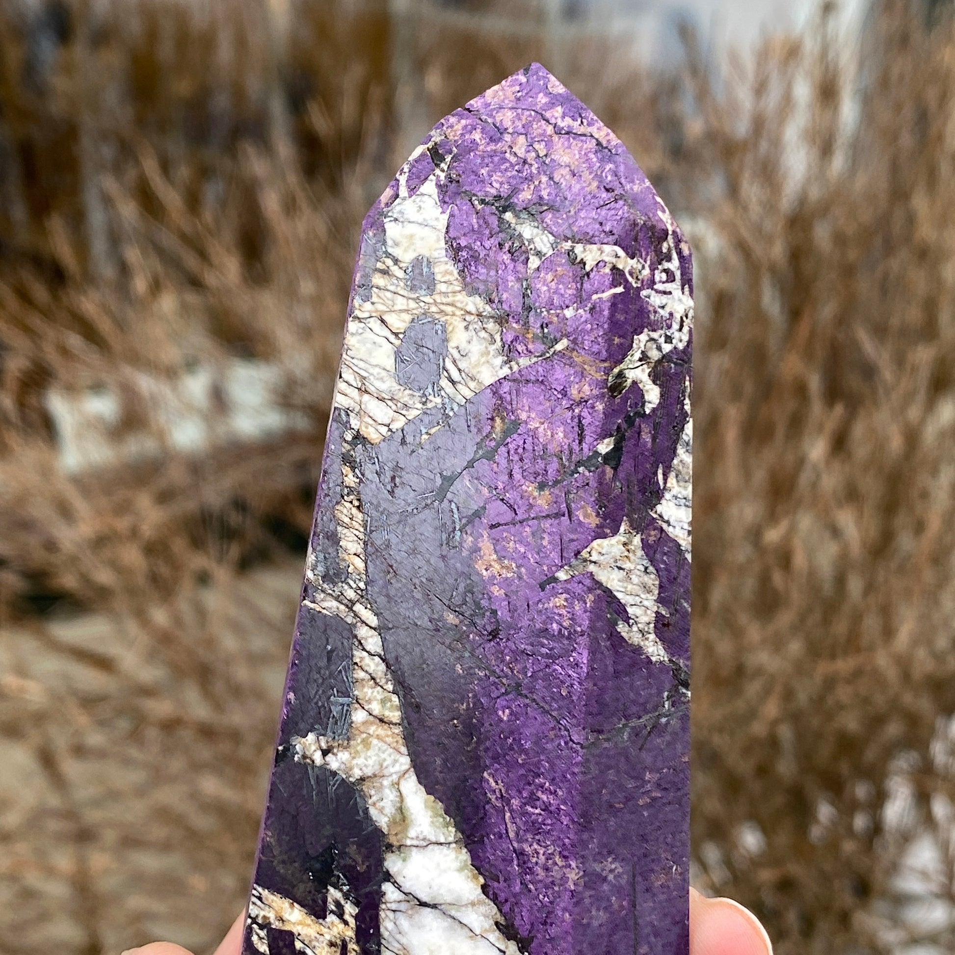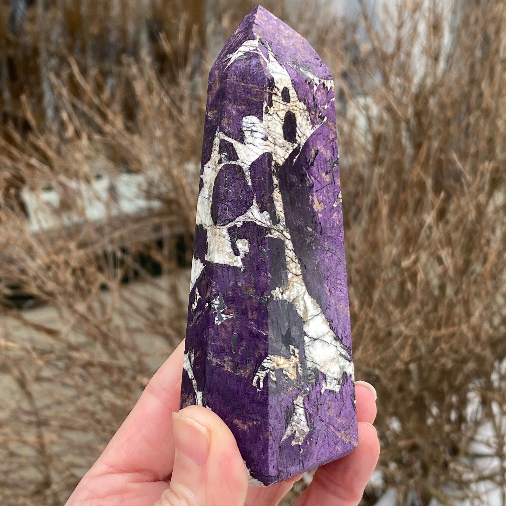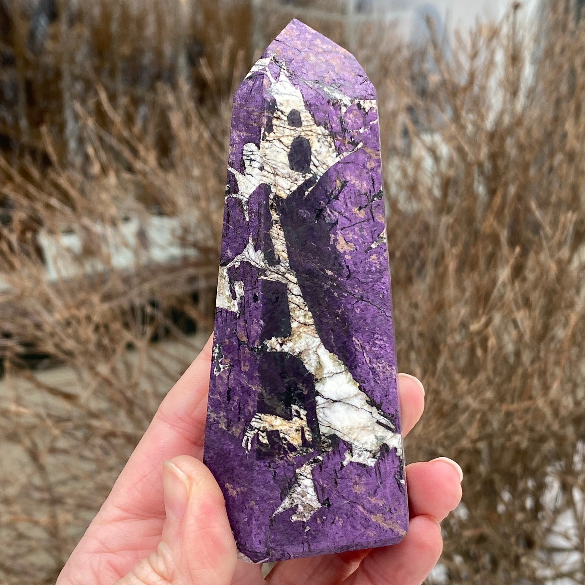 This is a large, Purpurite tower. So difficult to find nicely polished Purpurite that retains its color and flash. This piece has brilliant color and very cool contrast with the white matrix. From the Tucson Gem Show 2026. You will receive the exact Purpurite generator tower shown. Purpurite is a rare manganese iron phosphate mineral.