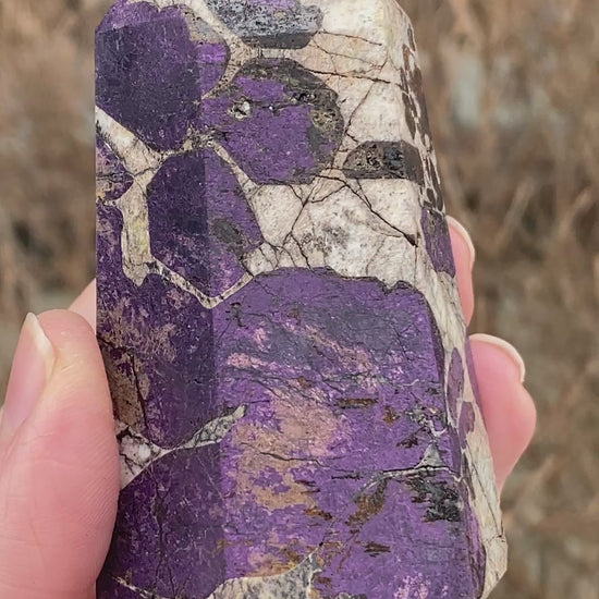 This is a large, Purpurite tower. So difficult to find nicely polished Purpurite that retains its color and flash. This piece has brilliant color and very cool contrast with the white matrix. From the Tucson Gem Show 2026. You will receive the exact Purpurite generator tower shown. Purpurite is a rare manganese iron phosphate mineral.