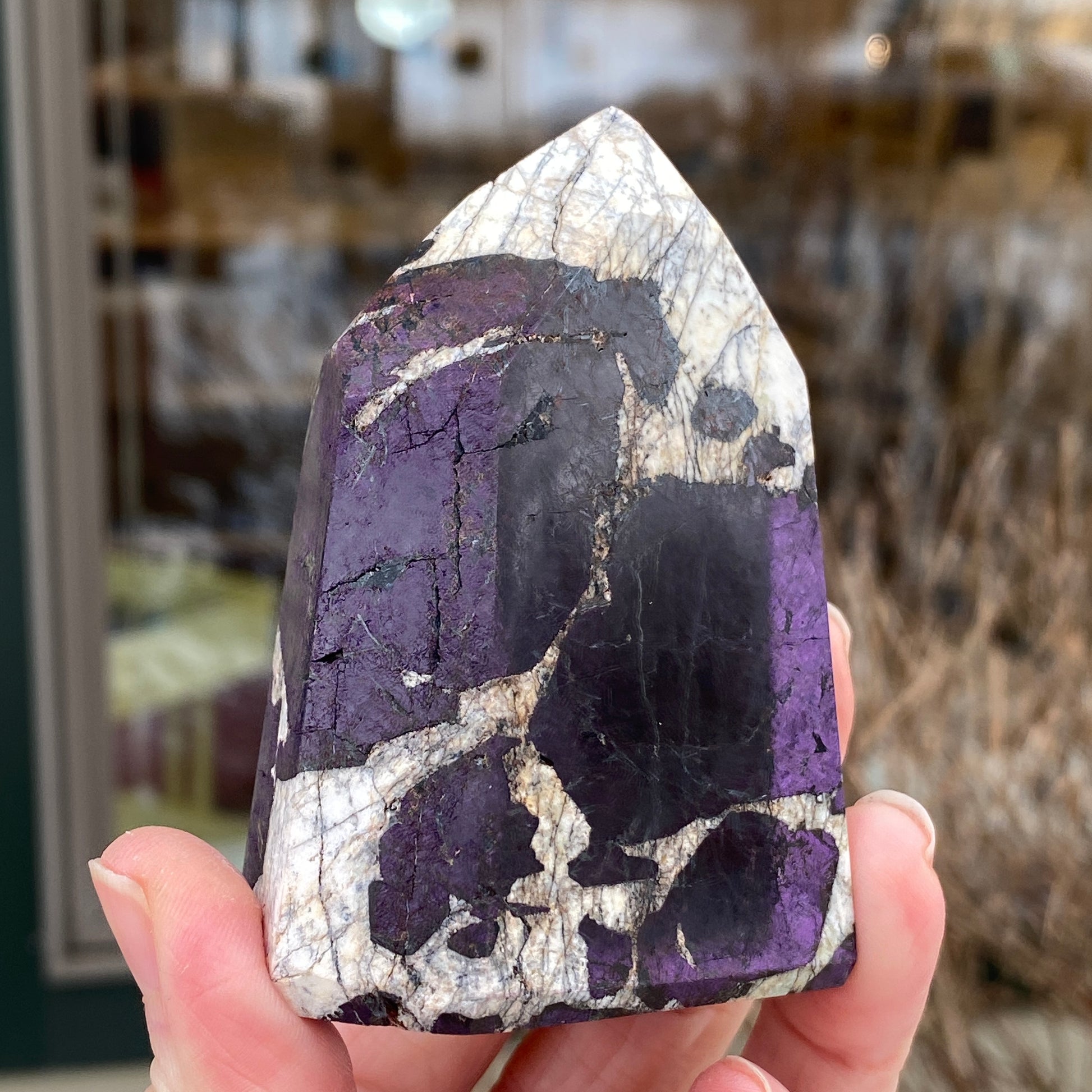 A very cool Purpurite tower. So difficult to find nicely polished Purpurite that retains its color and flash. This piece has brilliant color and interesting contrast with the white matrix. From the Tucson Gem Show 2026. You will receive the exact Purpurite generator tower shown. Purpurite is a rare manganese iron phosphate mineral.