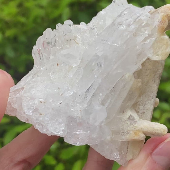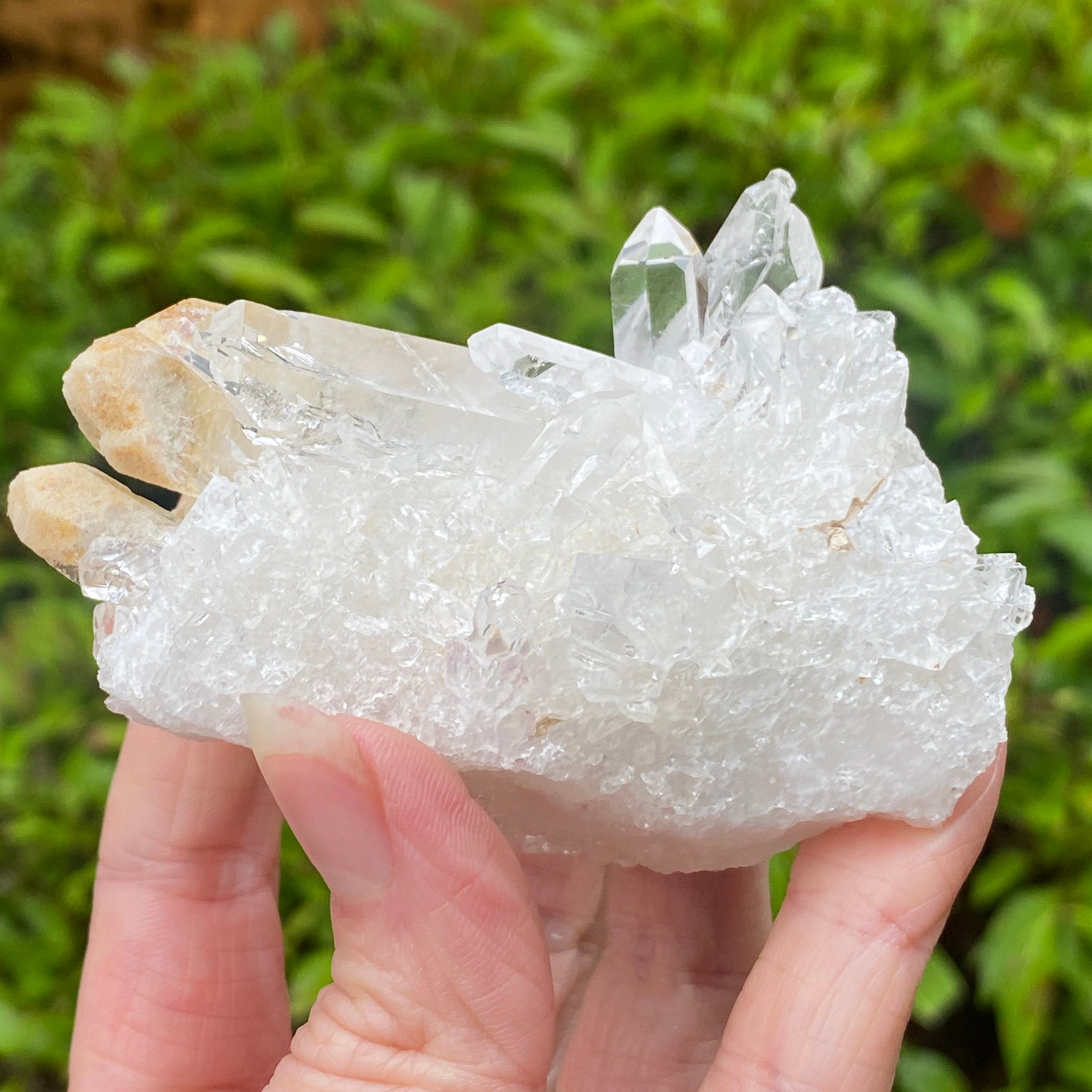 A lovely, natural raw Clear Quartz cluster. This is an interesting one. Really sparkly and clear on one side, then some secondary growth over the other. You will receive the exact Quartz Cluster shown. This Clear Quartz crystal hails from Brazil. Clear Quartz is considered an essential healing crystal and cluster shapes are great for infusing energy throughout a room or workspace.