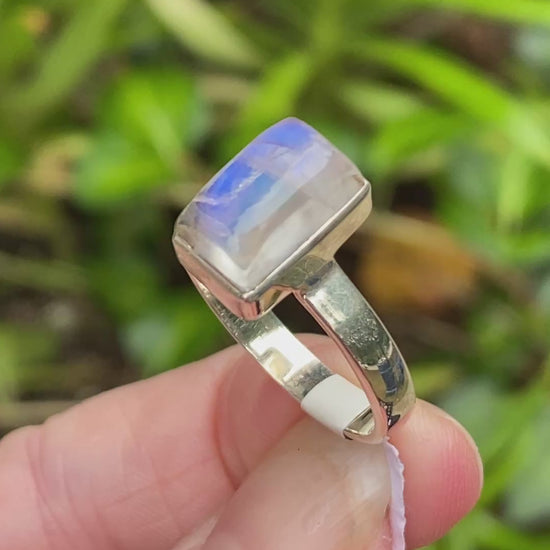 A classic Rainbow Moonstone ring with a high-quality, flashy Moonstone. Set in .925 Sterling. You will receive the exact Moonstone ring shown.