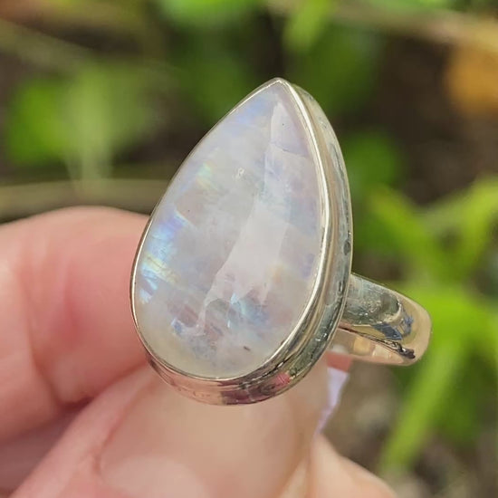A classic Rainbow Moonstone ring with a high-quality, flashy Moonstone. Set in .925 Sterling. You will receive the exact Moonstone ring shown.