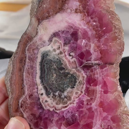 An incredibly rare find, this is a Cobaltoan Calcite Stalactite Slab. Currently, the only available example of a Cobaltoan Calcite stalactite available to purchase online. This material does not typically form stalactites; this is likely a pseudomorph where the original stalactite was replaced with Cobaltoan Calcite. Fully intact. Both the quality of gems and color is excellent. This would have come from a very large formation. Stalactites can take up to a million years per inch of growth. I found this lot in Tucson in 2022.
