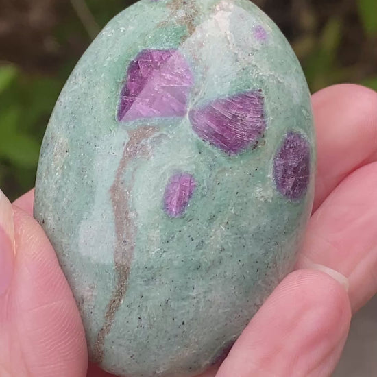A stone for the Heart Chakra, Ruby Fuchsite is the perfect combination for love, fertility, and positive growth. The contrasting colors and densities of these stones is a wonderful symbol of unity, togetherness and a lasting bond. Fuchsite, or Verdite, is a form of Muscovite that contains Chromium, giving it a natural, pastel green color. It is also Chromium that gives Ruby its red color. Fuchsite and Ruby both form independently of each other, but occasionally occur together creating the beautiful combination stone Ruby Fuchsite. Fuchsite is pronounced ‘fook'site