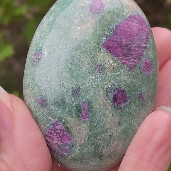 A stone for the Heart Chakra, Ruby Fuchsite is the perfect combination for love, fertility, and positive growth. The contrasting colors and densities of these stones is a wonderful symbol of unity, togetherness and a lasting bond. Fuchsite, or Verdite, is a form of Muscovite that contains Chromium, giving it a natural, pastel green color. It is also Chromium that gives Ruby its red color. Fuchsite and Ruby both form independently of each other, but occasionally occur together creating the beautiful combination stone Ruby Fuchsite. Fuchsite is pronounced ‘fook'site