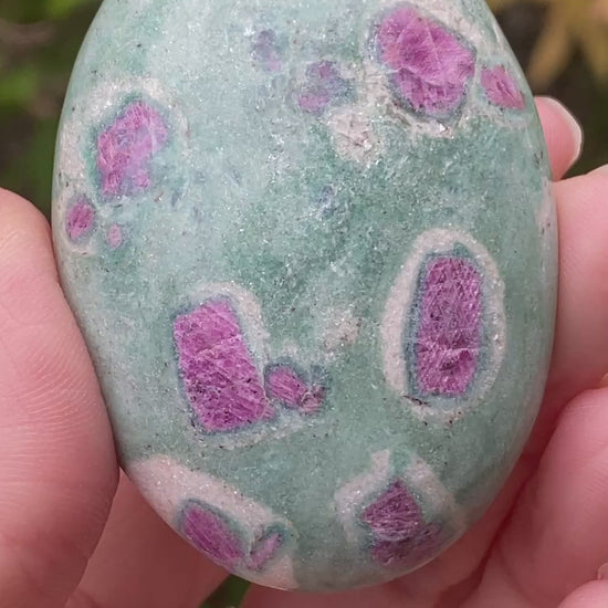 A stone for the Heart Chakra, Ruby Fuchsite is the perfect combination for love, fertility, and positive growth. The contrasting colors and densities of these stones is a wonderful symbol of unity, togetherness and a lasting bond. Fuchsite, or Verdite, is a form of Muscovite that contains Chromium, giving it a natural, pastel green color. It is also Chromium that gives Ruby its red color. Fuchsite and Ruby both form independently of each other, but occasionally occur together creating the beautiful combination stone Ruby Fuchsite. Fuchsite is pronounced ‘fook'site