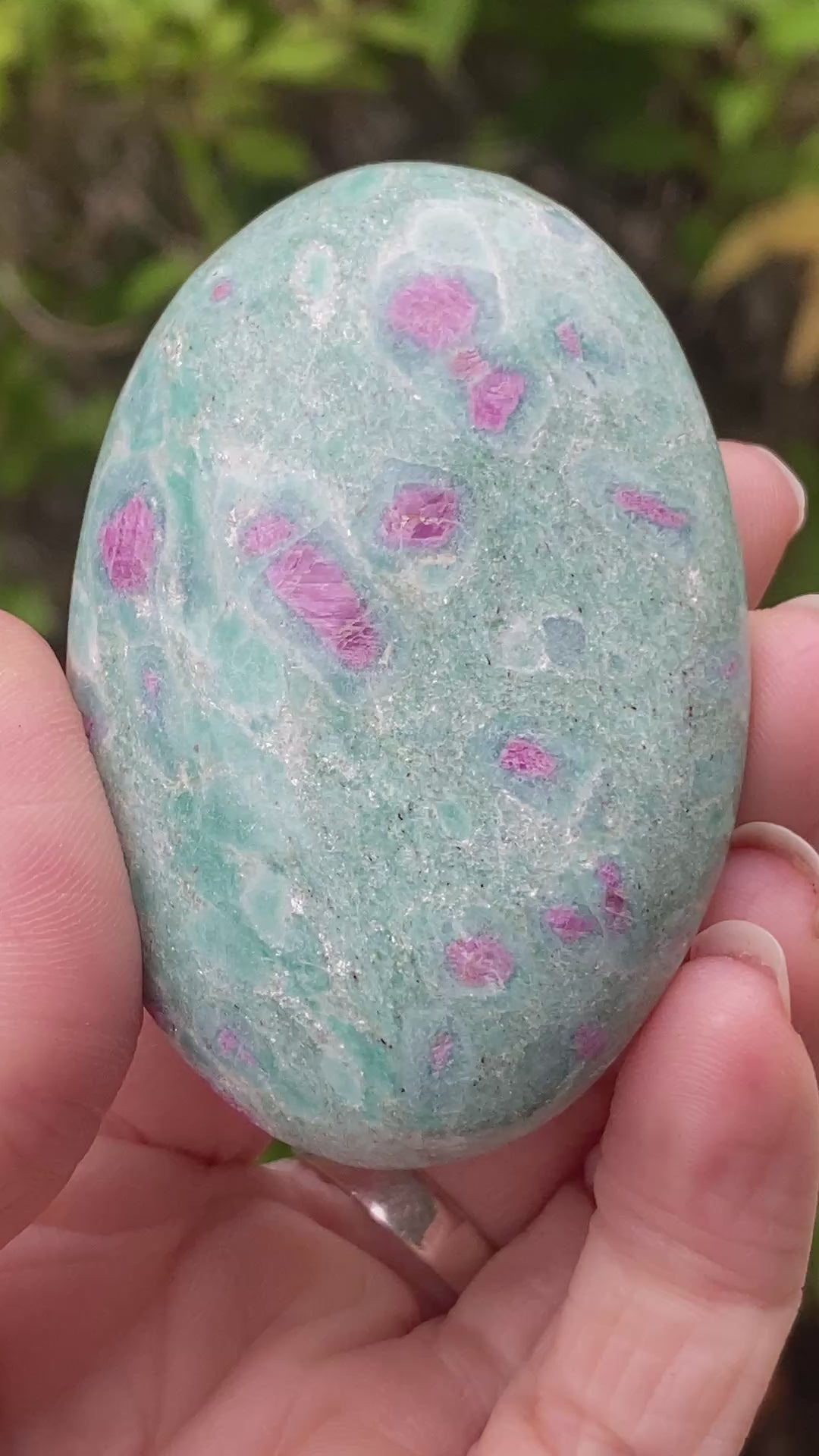 A stone for the Heart Chakra, Ruby Fuchsite is the perfect combination for love, fertility, and positive growth. The contrasting colors and densities of these stones is a wonderful symbol of unity, togetherness and a lasting bond. Fuchsite, or Verdite, is a form of Muscovite that contains Chromium, giving it a natural, pastel green color. It is also Chromium that gives Ruby its red color. Fuchsite and Ruby both form independently of each other, but occasionally occur together creating the beautiful combination stone Ruby Fuchsite. Fuchsite is pronounced ‘fook'site