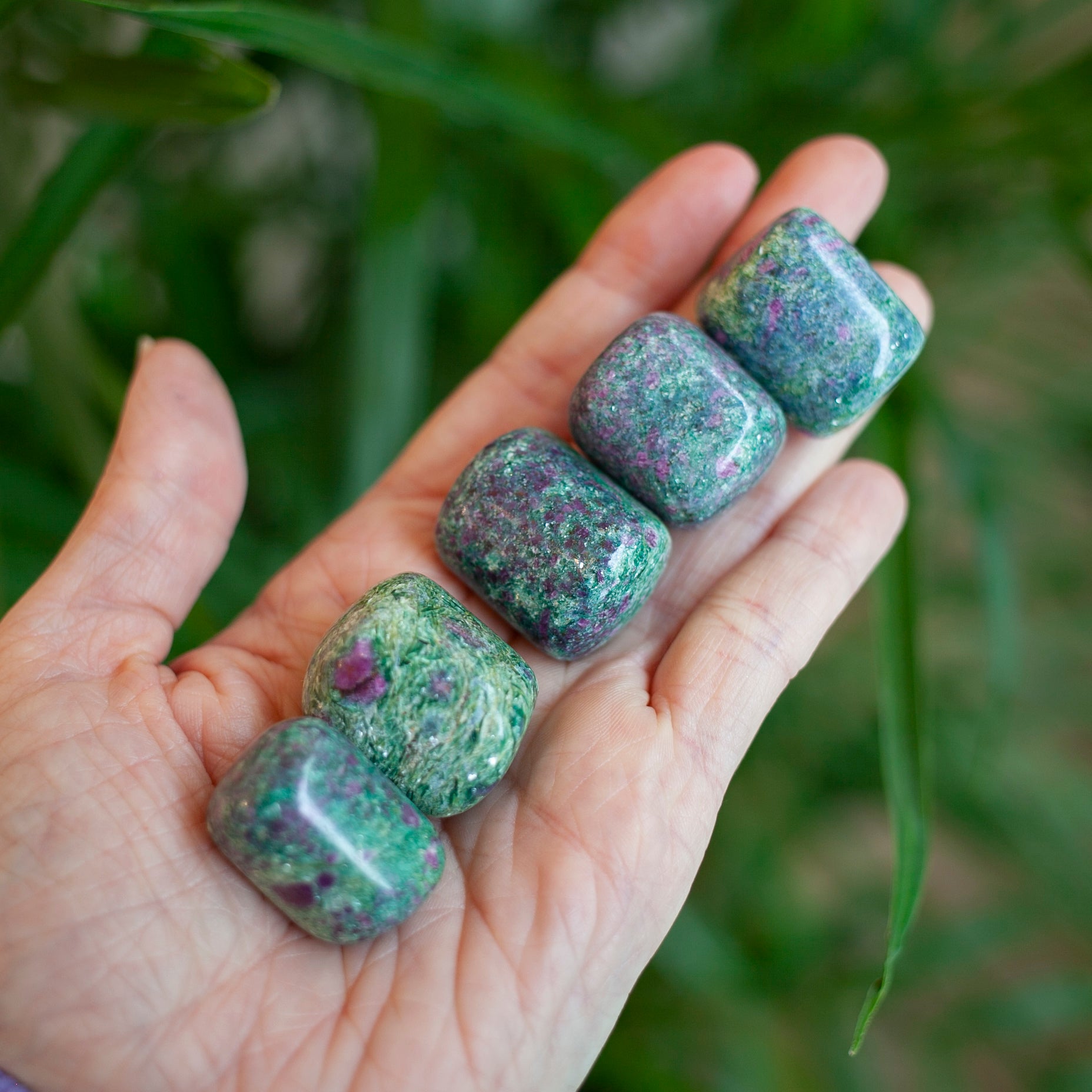 Gorgeous carved Ruby in Fuchsite stones with beautiful color and even shape. These are excellent quality stones, displaying classic magenta spots of corundum in green Fuchsite. Blue Kyanite is mingled throughout giving it an aqua/teal color. Each stone is about 1" in length.