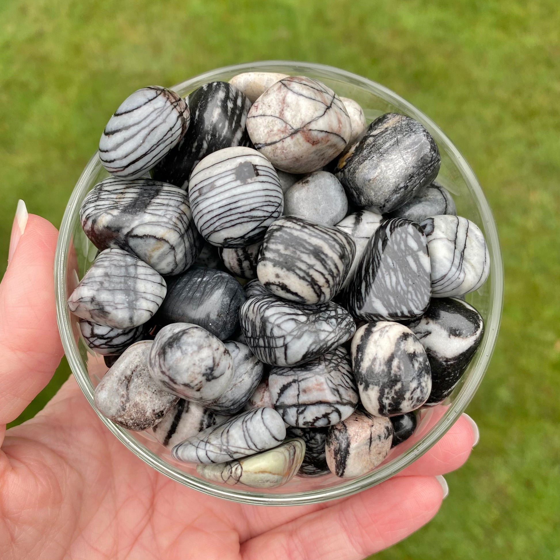 Enchanting Spiderweb Jasper stones with striking black webbing covering a white base. These are all lovely, captivating stones. This listing is for one stone like the pictures shown.