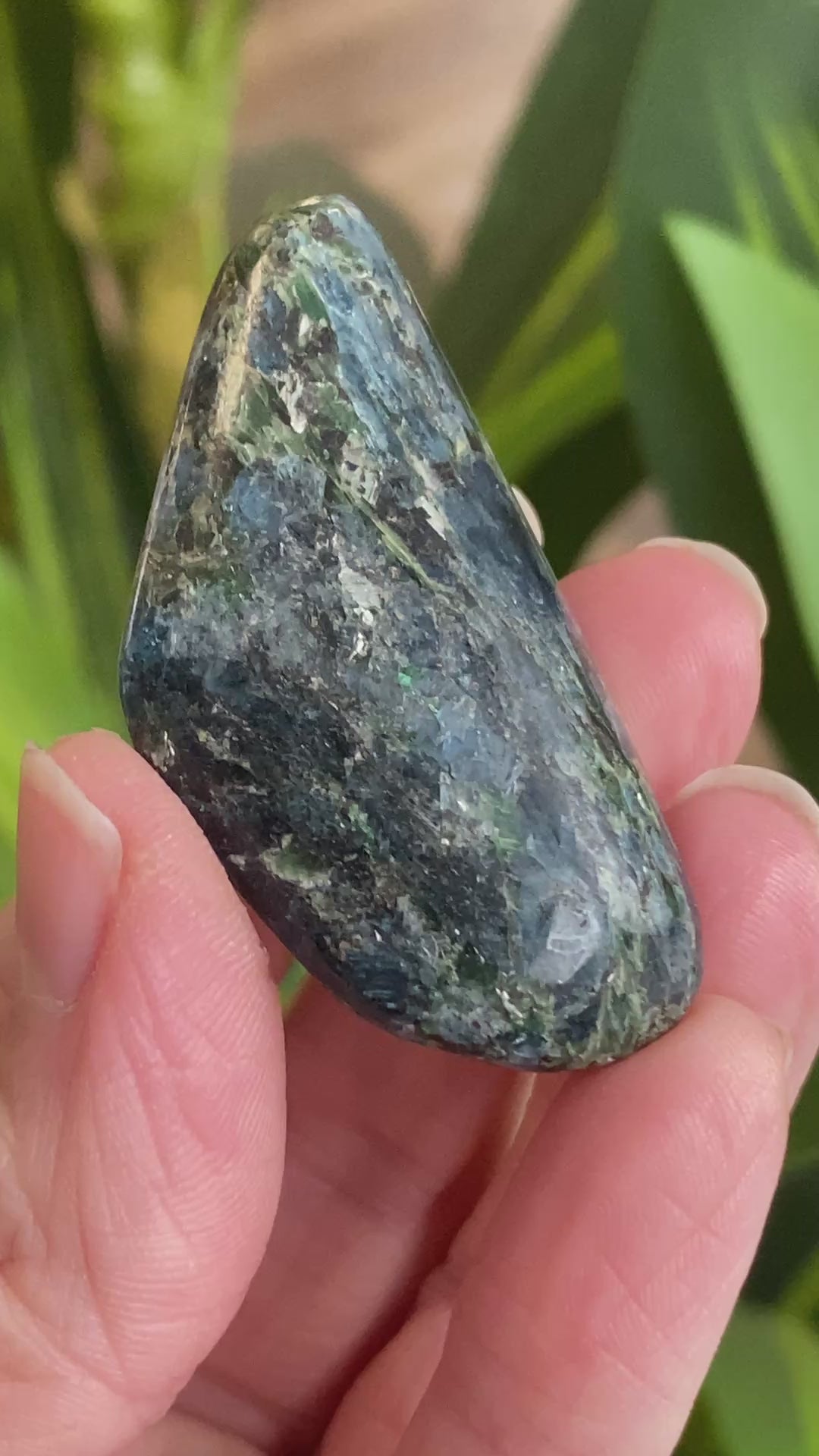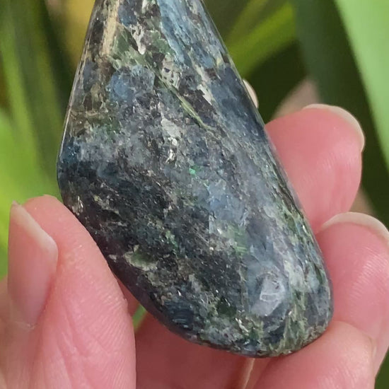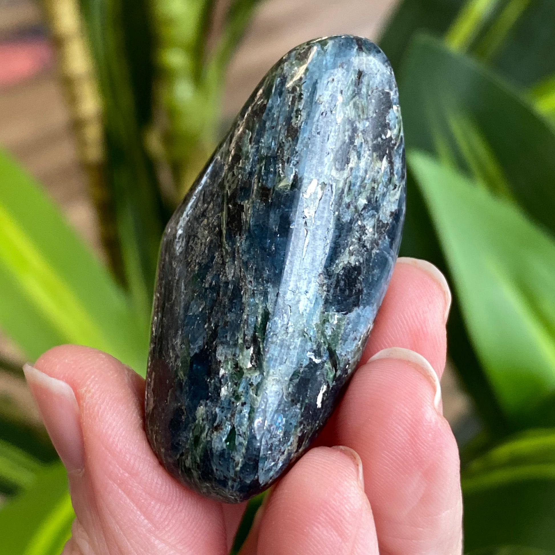 A lovely teal Kyanite stone hailing from Tanzania. A deep, unusual teal color. A very nice shape for holding. You will receive the exact Kyanite shown.