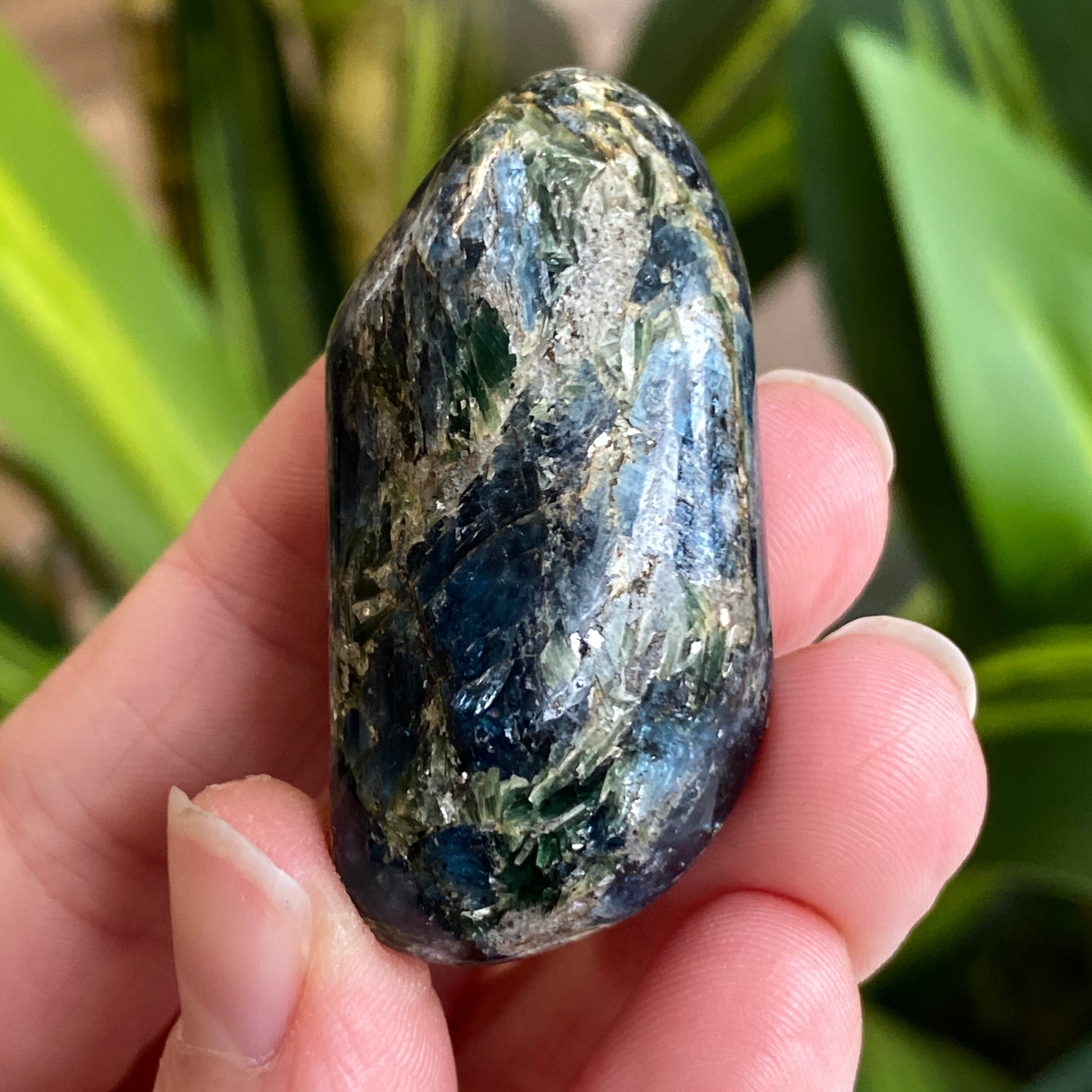 A lovely teal Kyanite stone hailing from Tanzania. A deep, unusual teal color. A very nice shape for holding. You will receive the exact Kyanite shown.