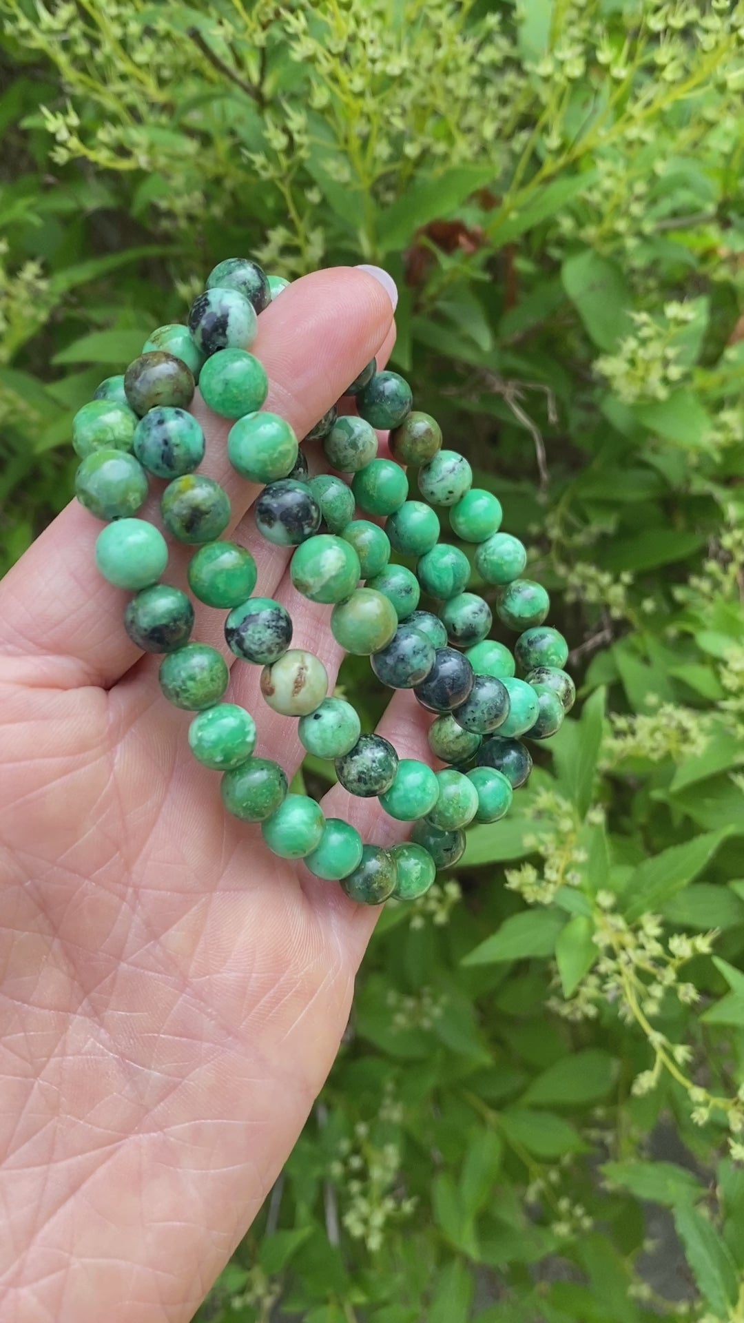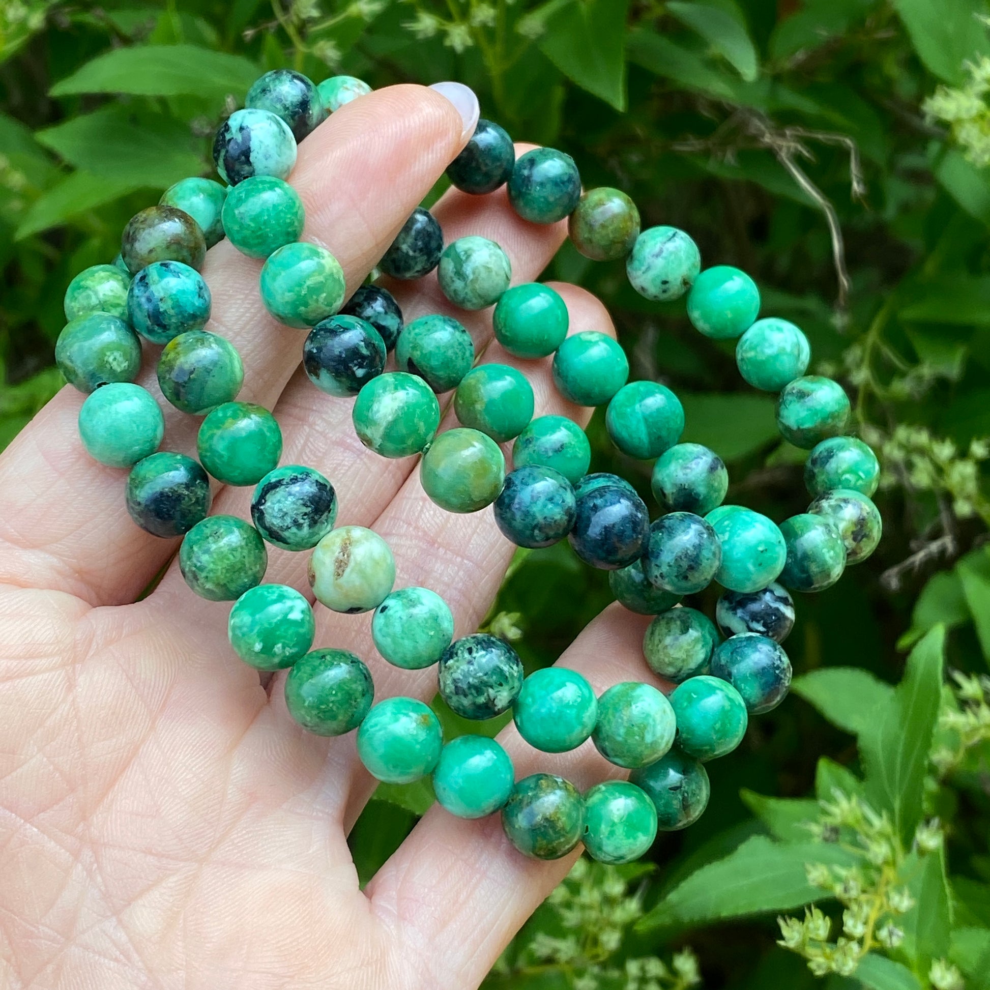 This listing is for one vibrant green Variscite bracelet. 7in size. Variscite is a relatively rare, lesser-known phosphate mineral. It aligns and balances one's connection to the body, mind, and spirit, achieving complete healing and transformation. Variscite restores energy and promotes spiritual personal, financial and all types of progress. Can assist in harnessing one's courage and inner strength, promoting fearlessness, endurance, and power. Variscite removes the fear, worry, anxiety, and tension in one's body while calming one's mind.