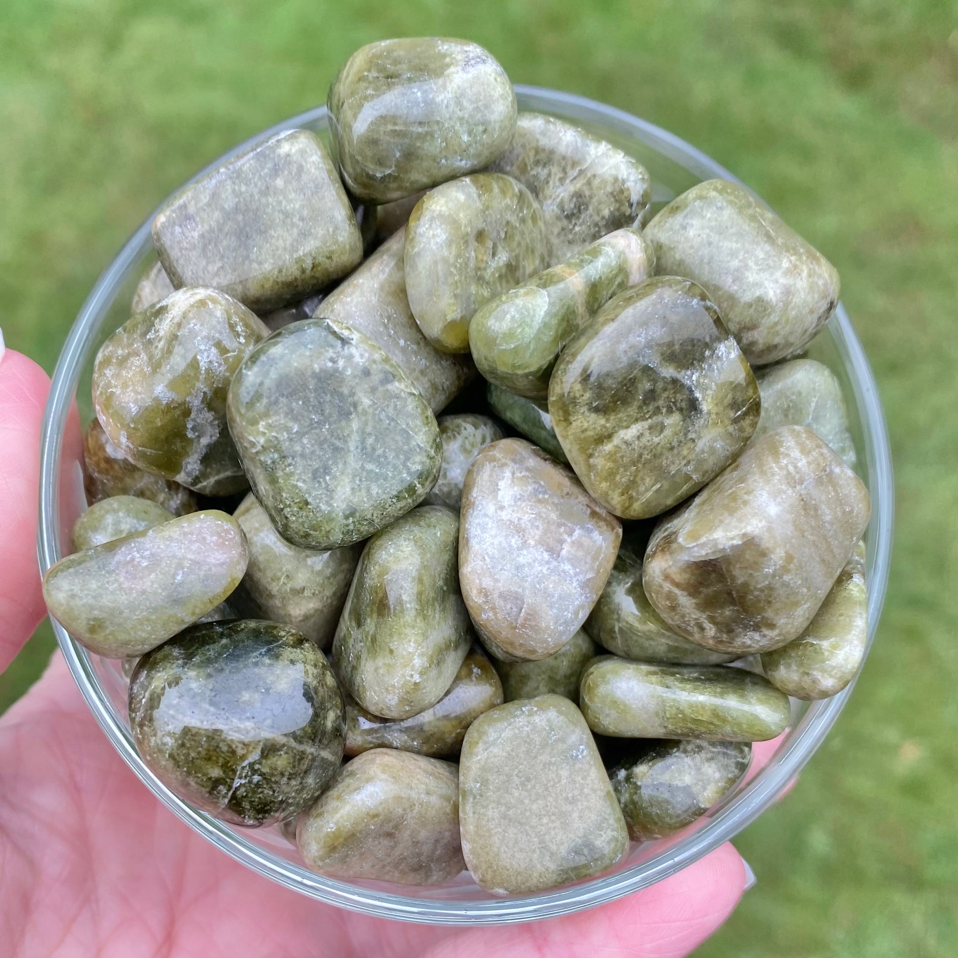 These are natural tumbled Vesuvianite stones with beautiful green color and a marbled appearance. Ideal for holding and small enough to carry or including in a medicine pouch.